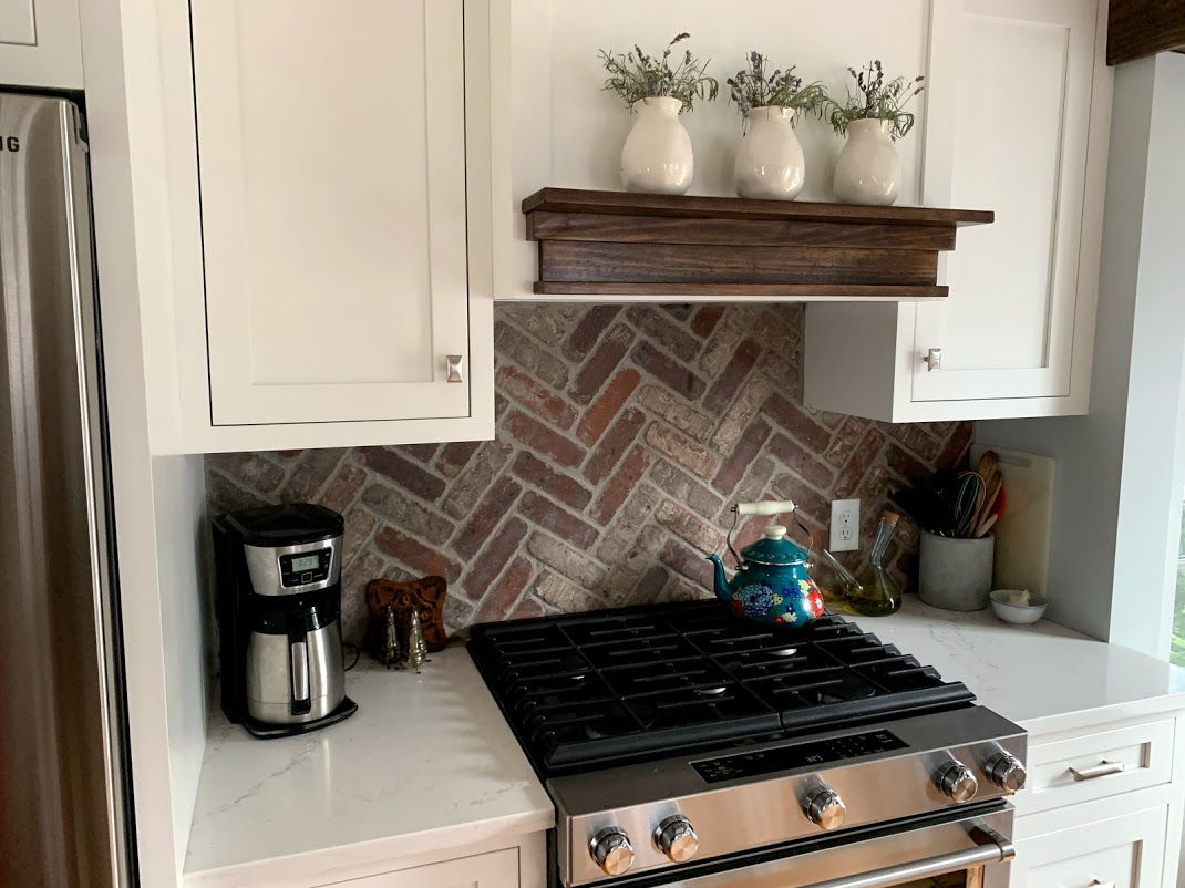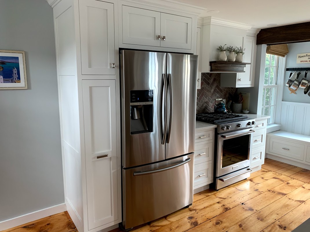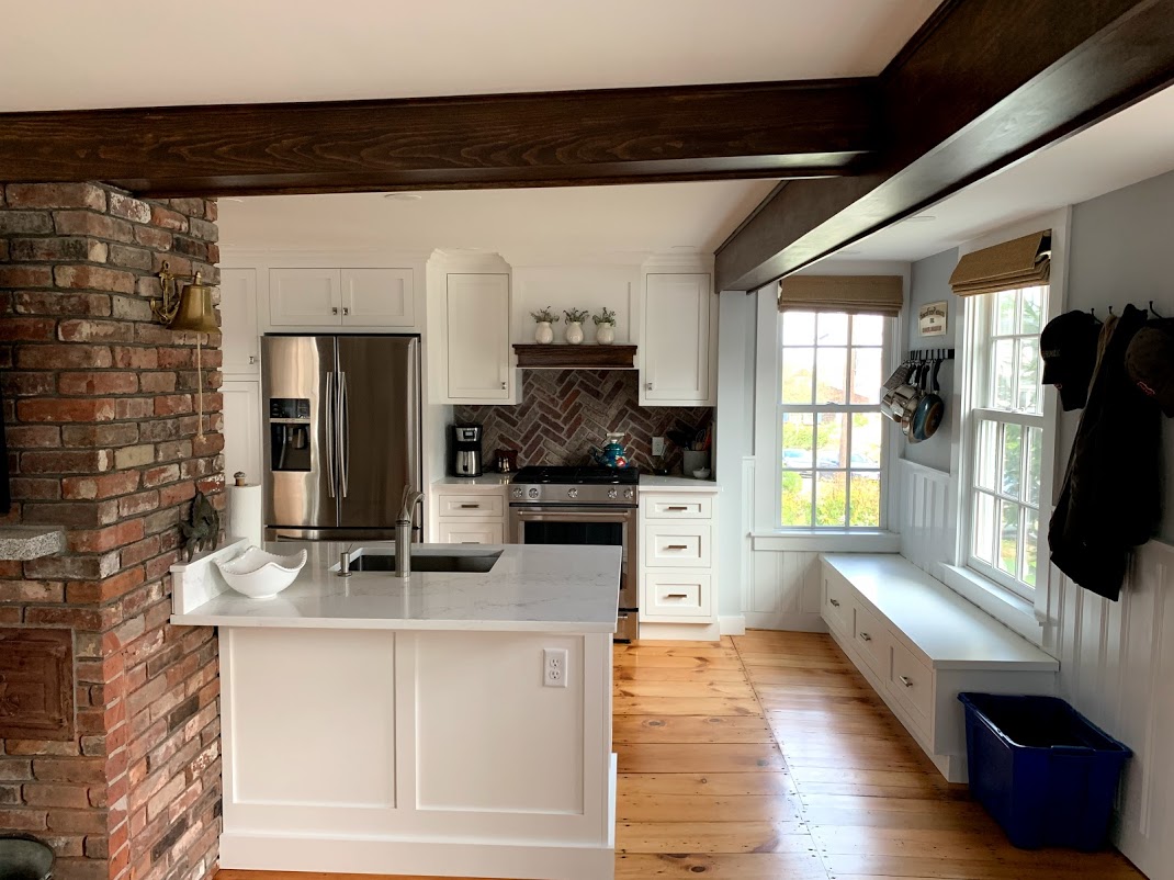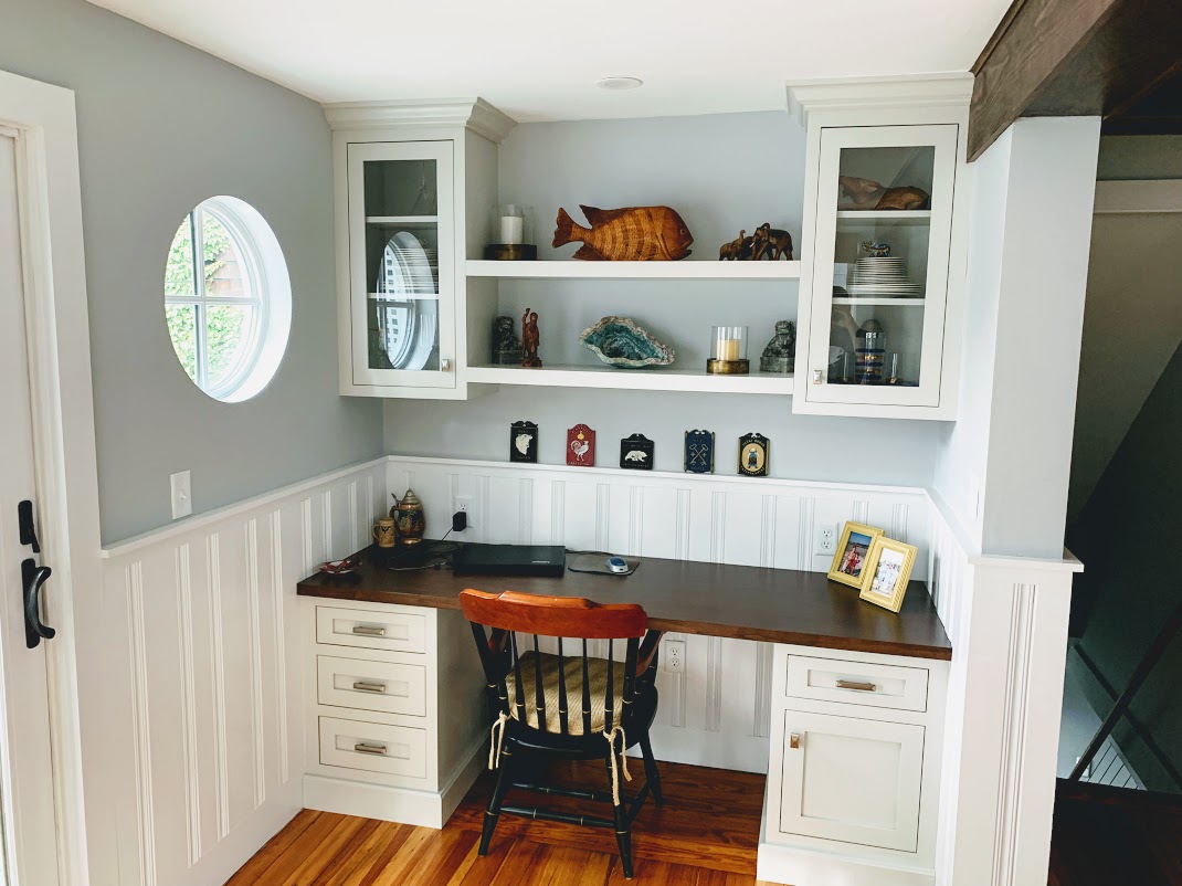The overall theme of this renovation was to make a small historic home more open and accessible for visiting family. We moved the dining area to front of the home and utilized custom bench seating to maximize storage and make the most of a small space. New windows fitting the historical character of the home help to brighten up the home. The cabinetry is all custom from Kountry Kraft. The homeowners needed an office space, so we moved the laundry and built the office into the previous laundry closet area, adding a round window that looks out to the ocean.